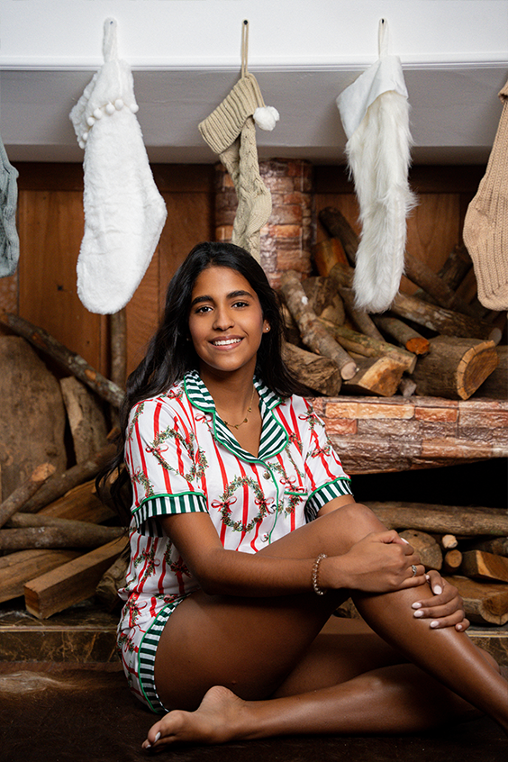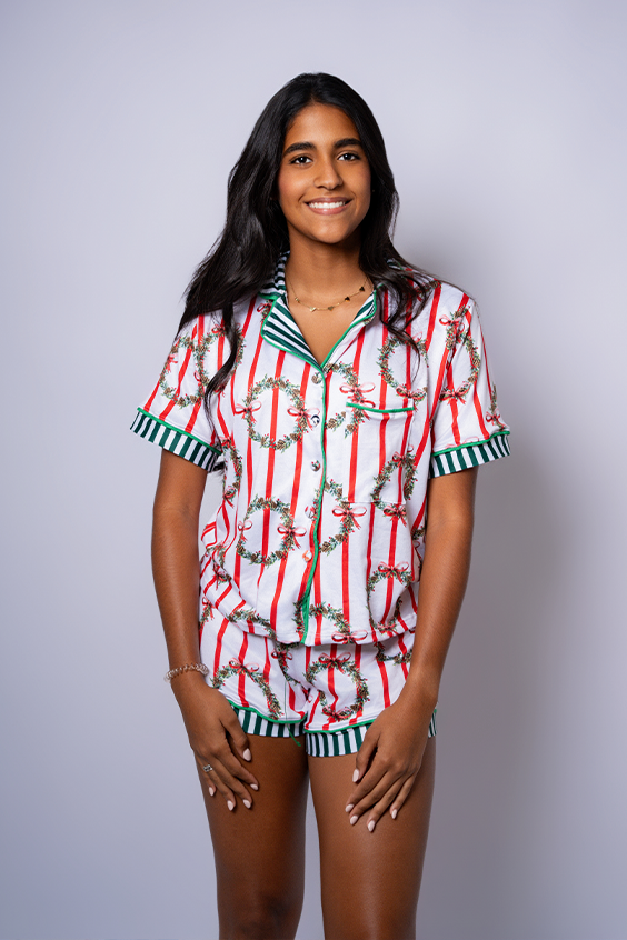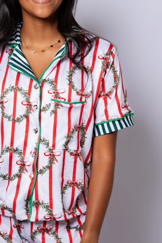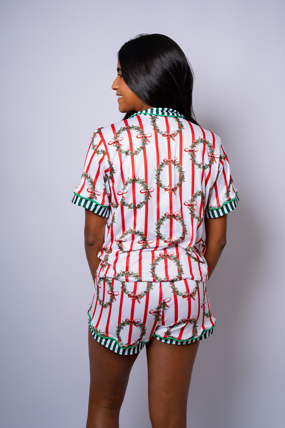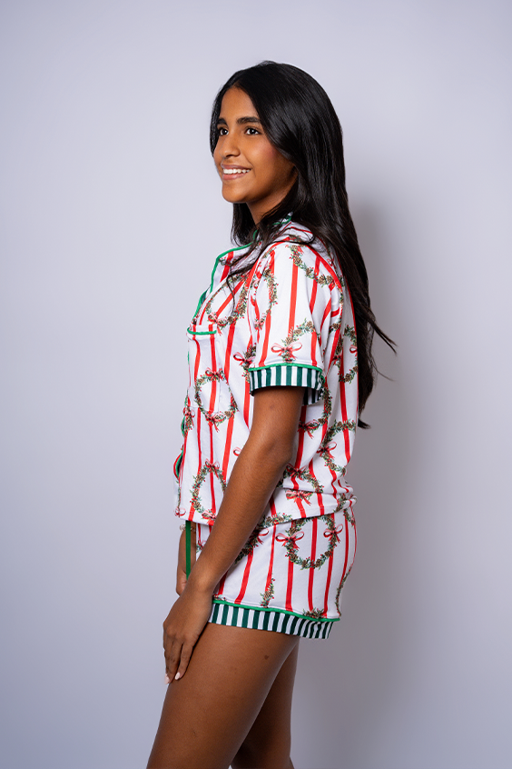 Step into the holiday season with our Amanda Pajama Set. This set pairs short sleeves and shorts, featuring vertical red stripes adorned with Christmas wreaths and bows. The green horizontal stripes on the cuffs and collar add a striking contrast, perfect for those festive nights in. Made from our signature Peach Skin fabric, it offers both comfort and a touch of holiday cheer.