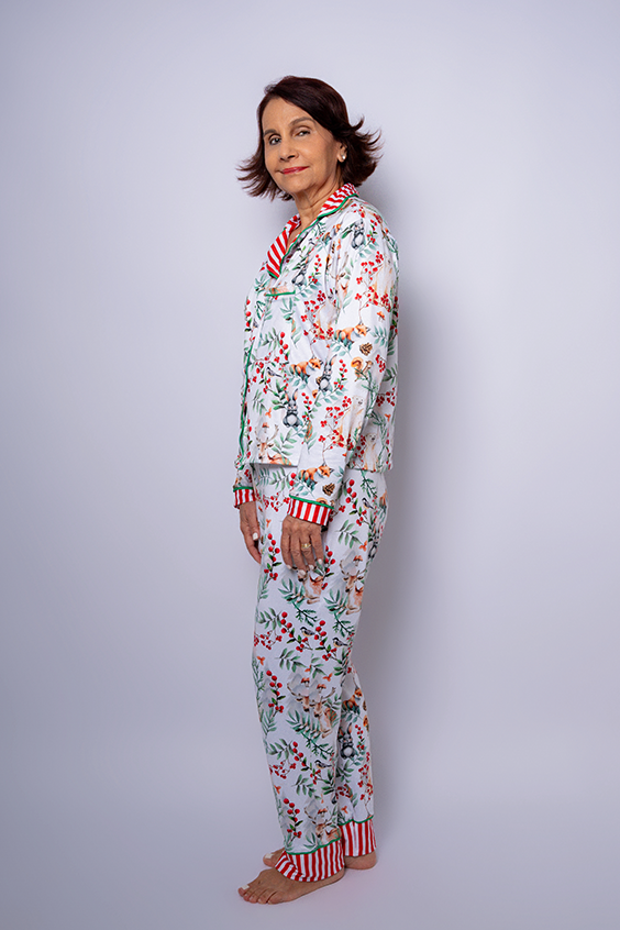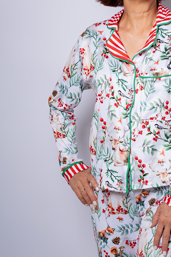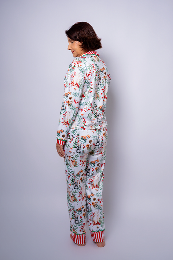 Wrap up warm in our Berry Pajama Set, ideal for chilly winter evenings. Featuring long sleeves and pants, this set showcases a festive print of reindeer amidst mistletoe and holly, accented with red-and-white striped trims for a cheerful holiday look. Made from breathable Peach Skin fabric, it offers cozy comfort that lasts all night.