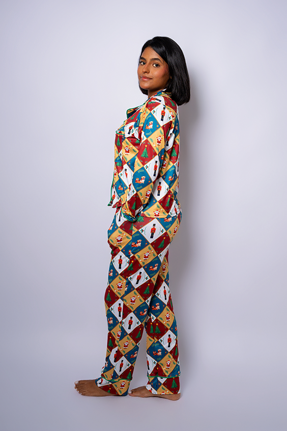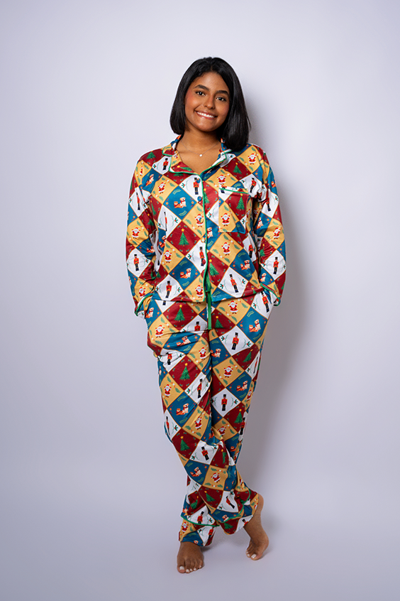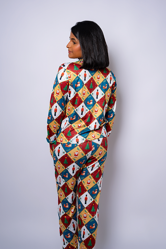 Wrap yourself in the festive spirit with our Ginger Pajama Set. Adorned with a lively Nutcracker and Christmas tree print set against a plaid backdrop of red, green, and gold, this set features long sleeves and pants for full comfort. Crafted from luxurious Peach Skin fabric, it's perfect for those chilly holiday nights or a cozy morning unwrapping gifts. Experience the ultimate in holiday comfort and style.