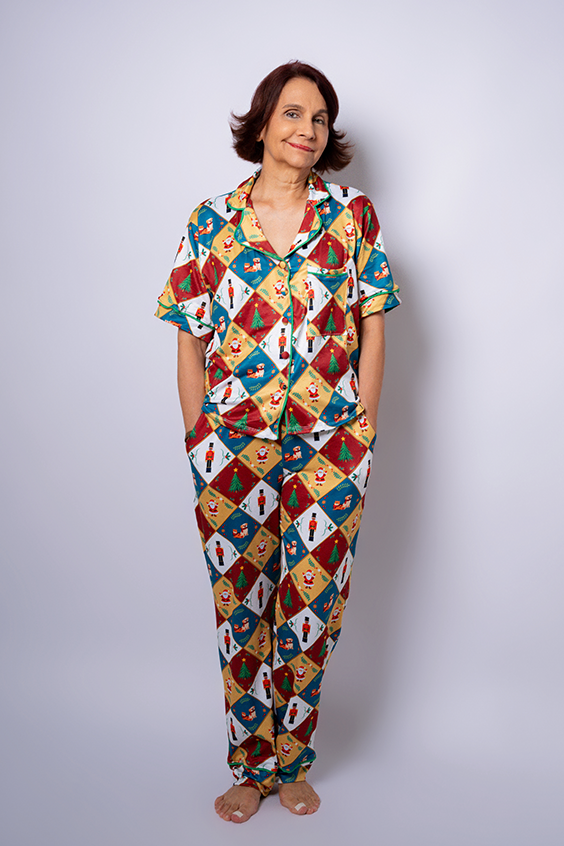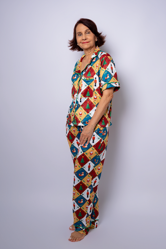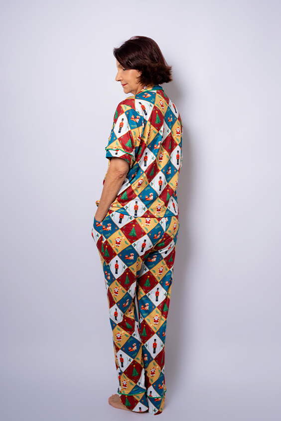 Celebrate the season in our Joy Pajama Set, featuring a charming pattern of Santa Claus, festive puppies, and Nutcrackers. This set combines the comfort of short sleeves with the warmth of long pants, all in our soft Peach Skin fabric. The checkered red, green, and gold squares bring a touch of holiday cheer to your sleepwear, making it ideal for lounging or a peaceful night's sleep under the twinkling lights.