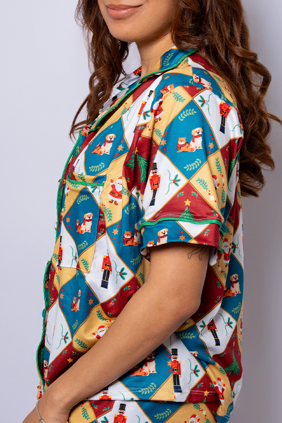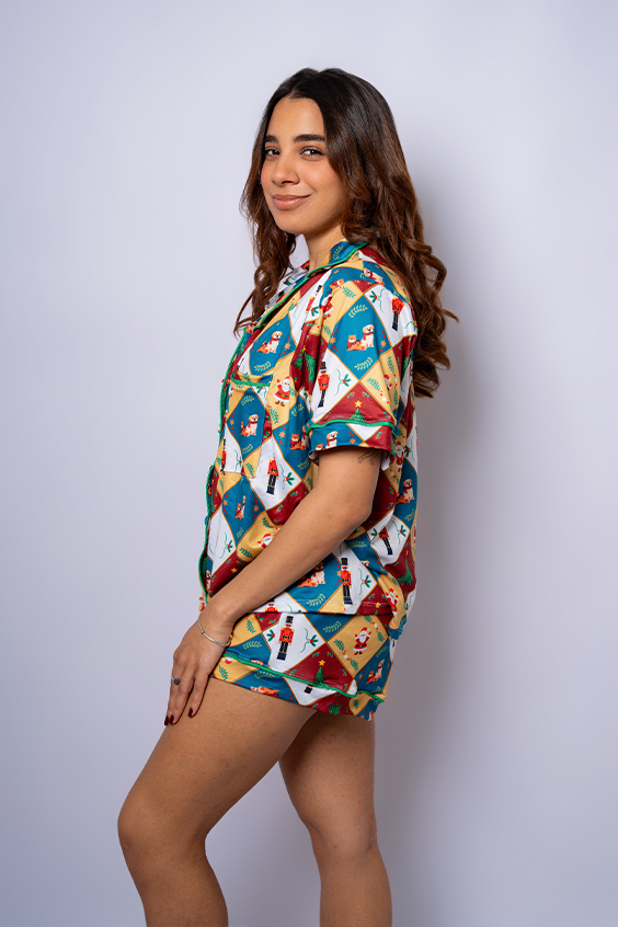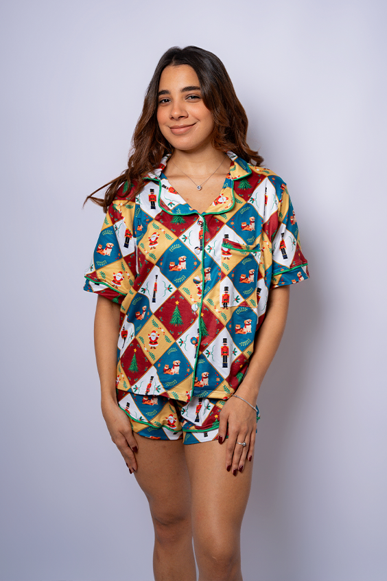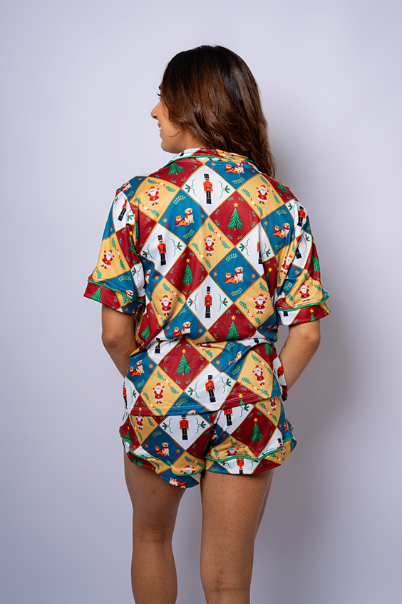 Embrace the holiday season with our Peppermint Pajama Set. This playful set includes short sleeves and shorts, perfect for warmer nights or relaxed mornings at home. Adorned with a cheerful pattern featuring peppermints and festive elements in a checkered design, the soft Peach Skin fabric ensures comfort with every wear. Add a dash of festive fun to your sleepwear collection with this delightfully spirited set.