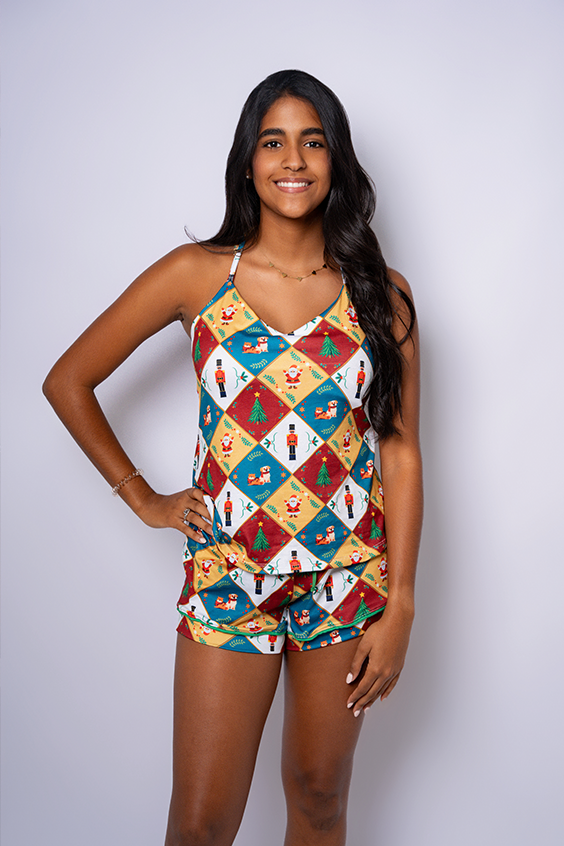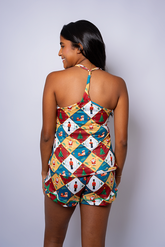 Light up your holiday evenings with our Twinkle Pajama Set. This sleeveless set with shorts is perfect for those who enjoy a cooler sleepwear option. Decorated with twinkling Christmas elements in a vibrant checkered pattern of red, green, and gold, the Peach Skin fabric offers a gentle touch against the skin. Ideal for relaxing after a day of holiday festivities, this set promises both style and comfort during the joyous season.