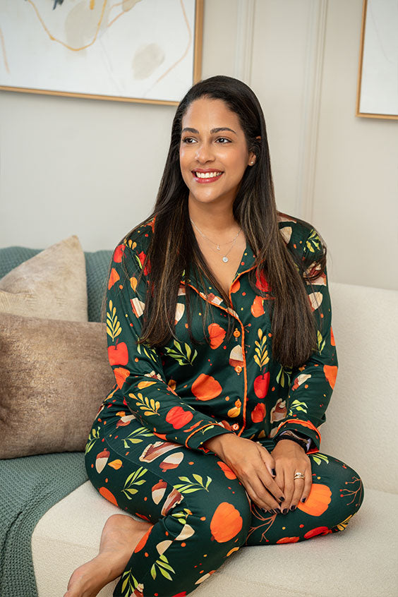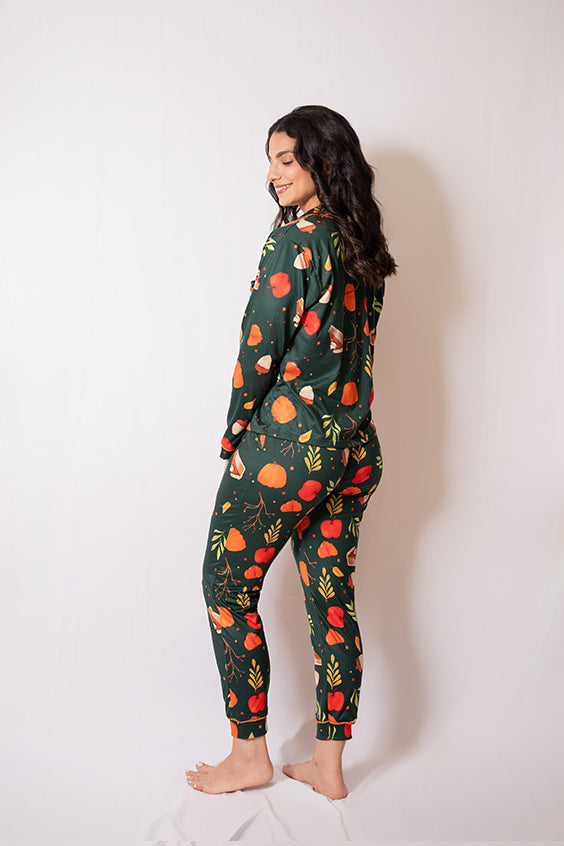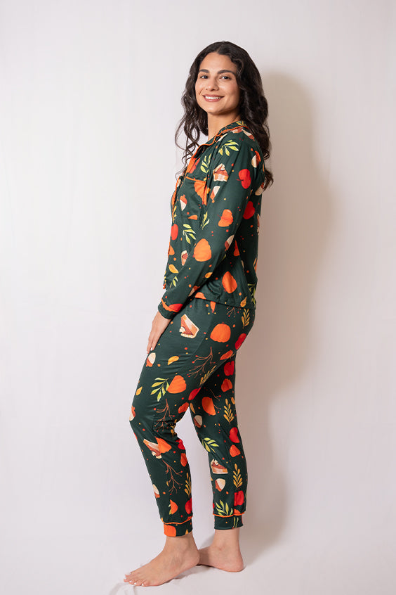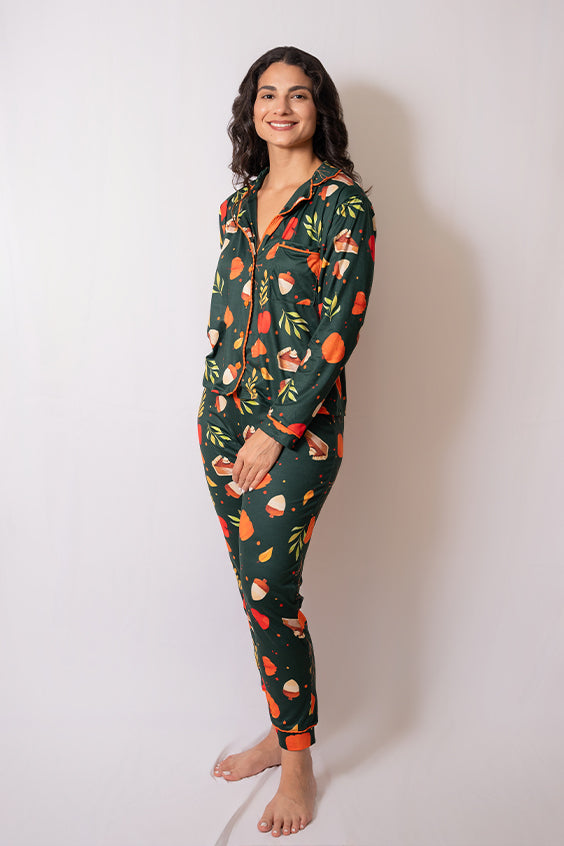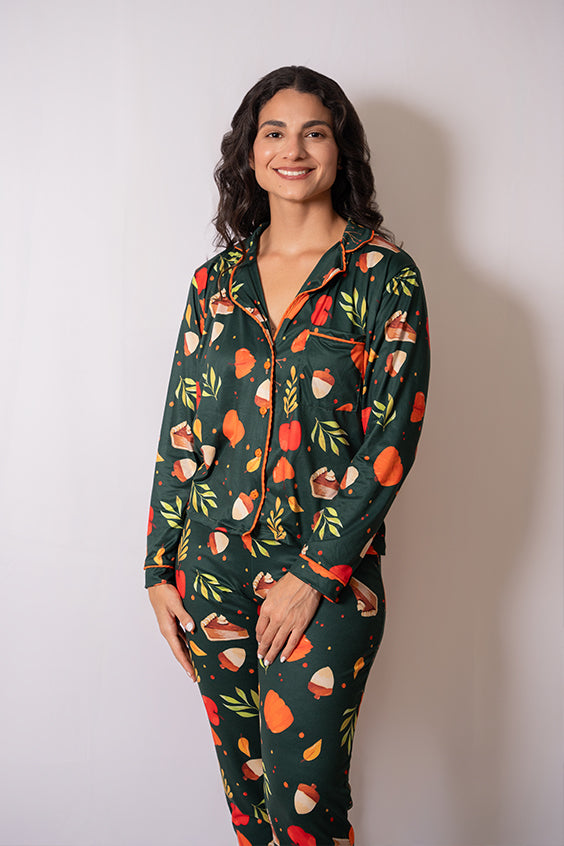 Embrace the comfort of our Pecan pajama set, featuring a lively orange and green leaf print that captures the essence of autumn's splendor. This set is available in options of long pants or shorts, complemented by a cozy short-sleeve top. Made from the softest Peach Skin fabric, it ensures a luxuriously soft feel, perfect for relaxing nights or lazy weekend mornings.