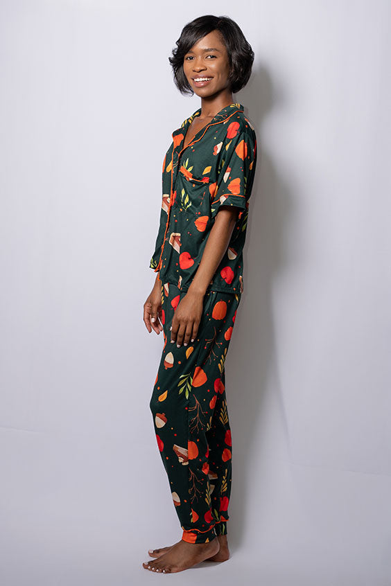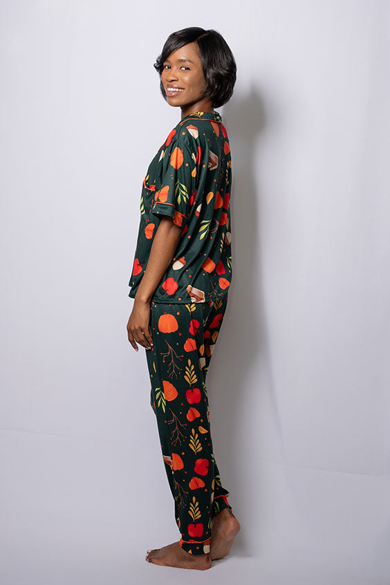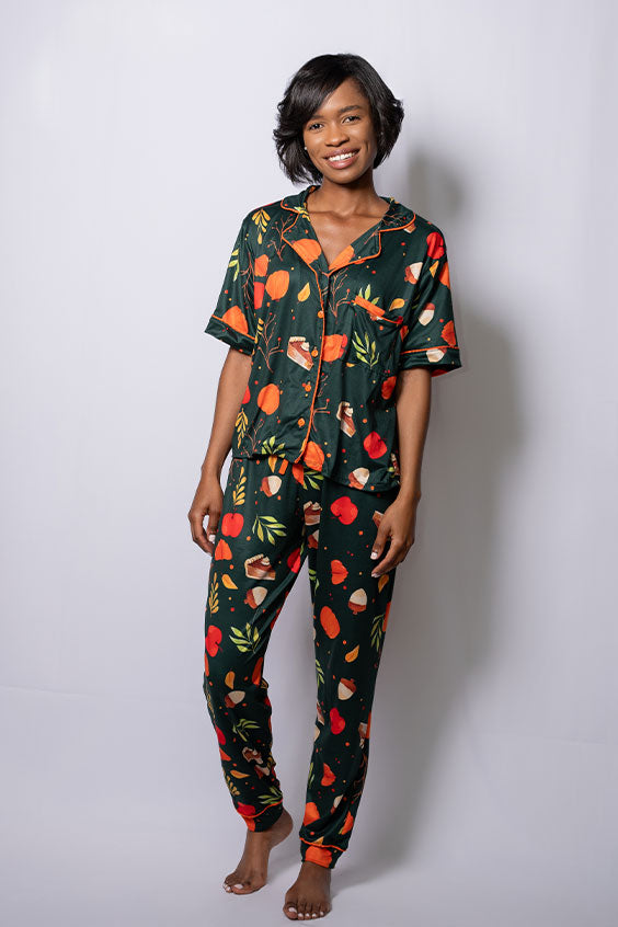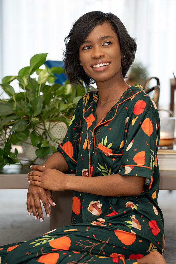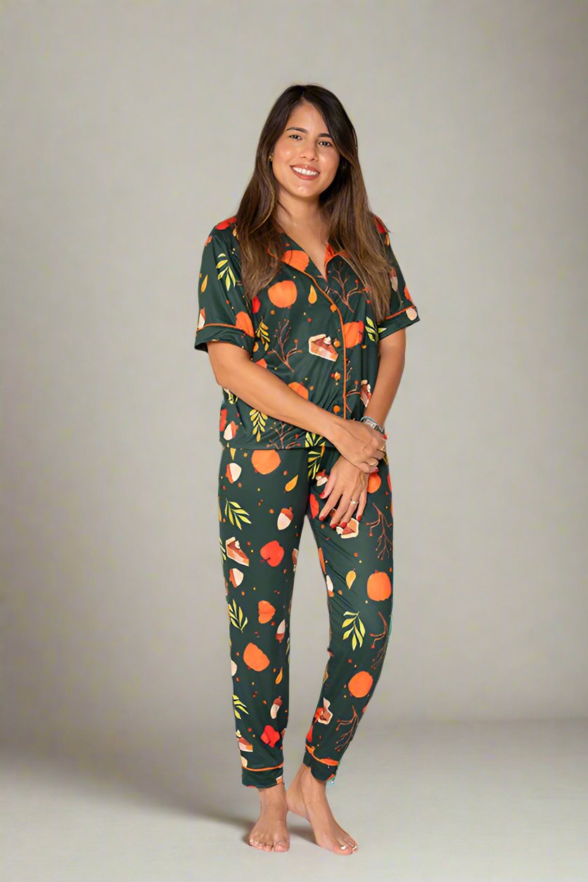 Welcome tranquility into your evenings with the Hazel pajama set, designed to blend style with supreme comfort. The vibrant leaf design merges orange hues with deep green, creating a visual echo of nature's beauty. Available in both long pants or shorts, the ensemble includes a harmonizing short-sleeve top made from our signature soft Peach Skin fabric. Ideal for those who cherish stylish, comfy sleepwear.
