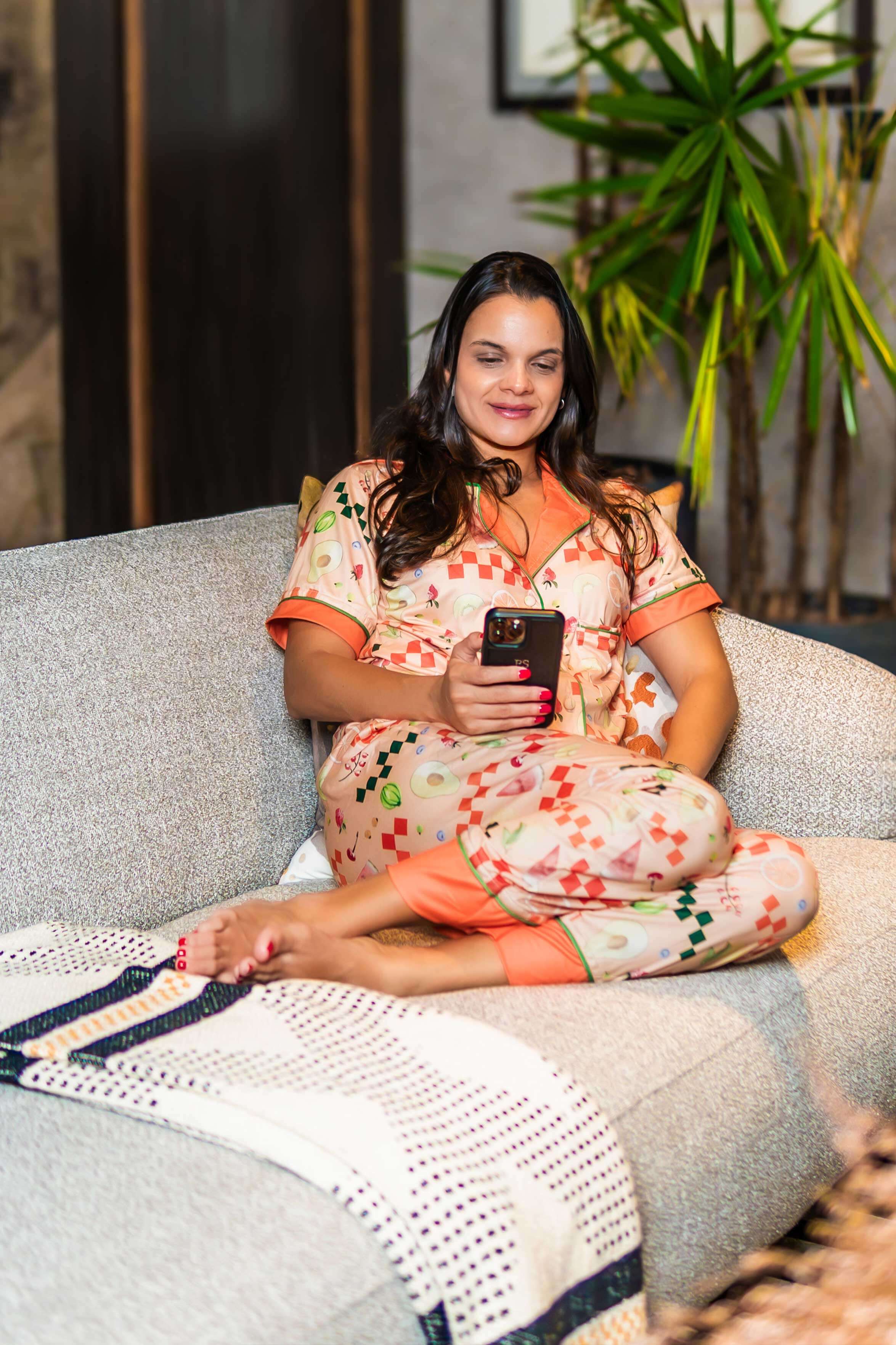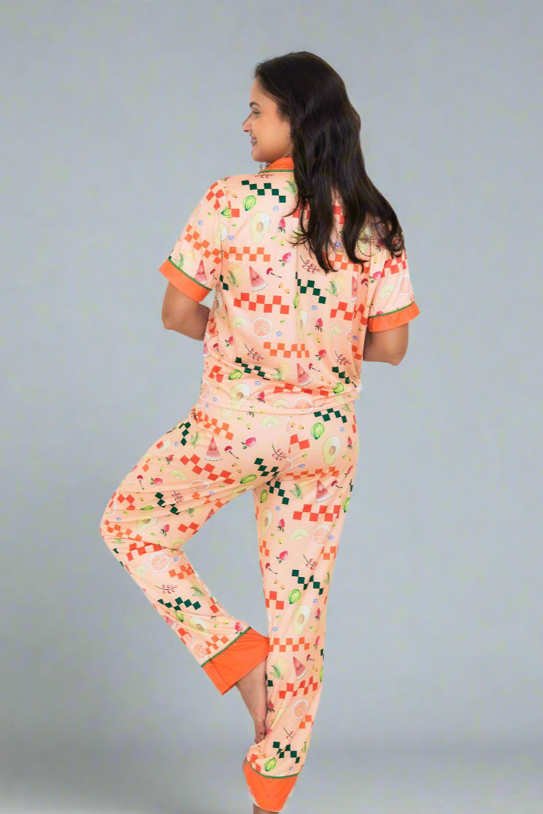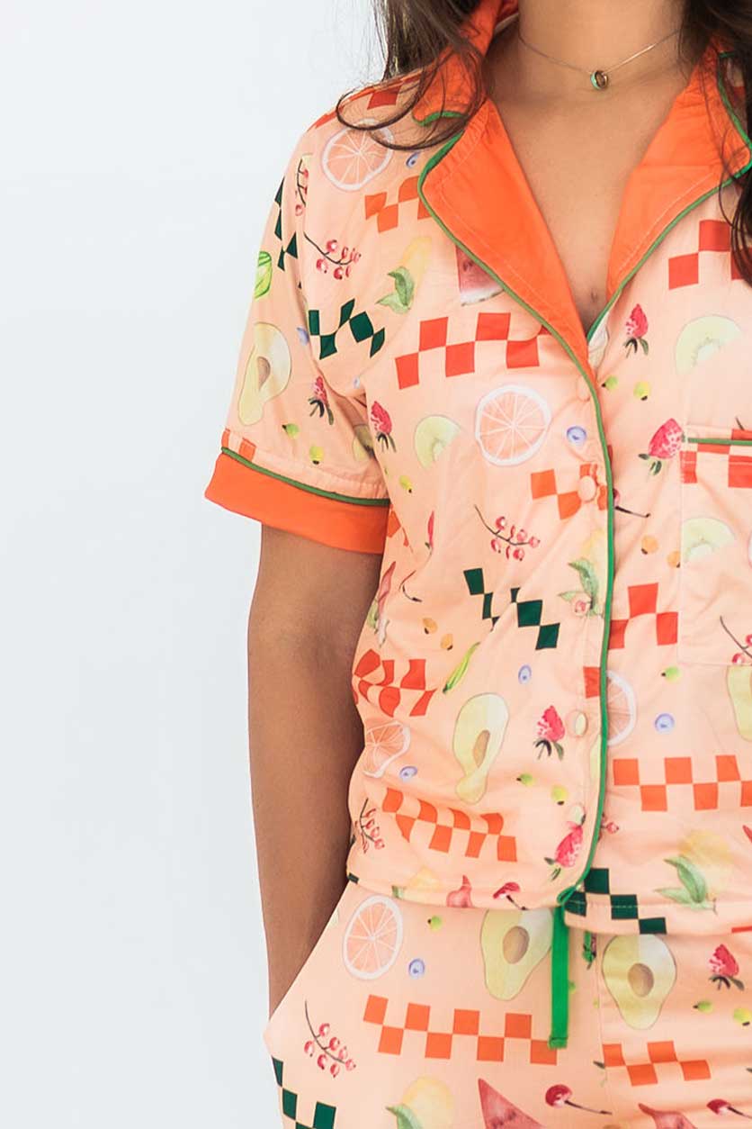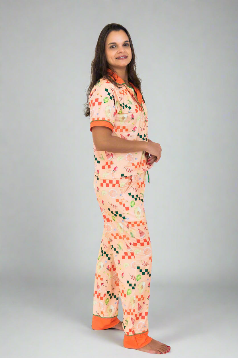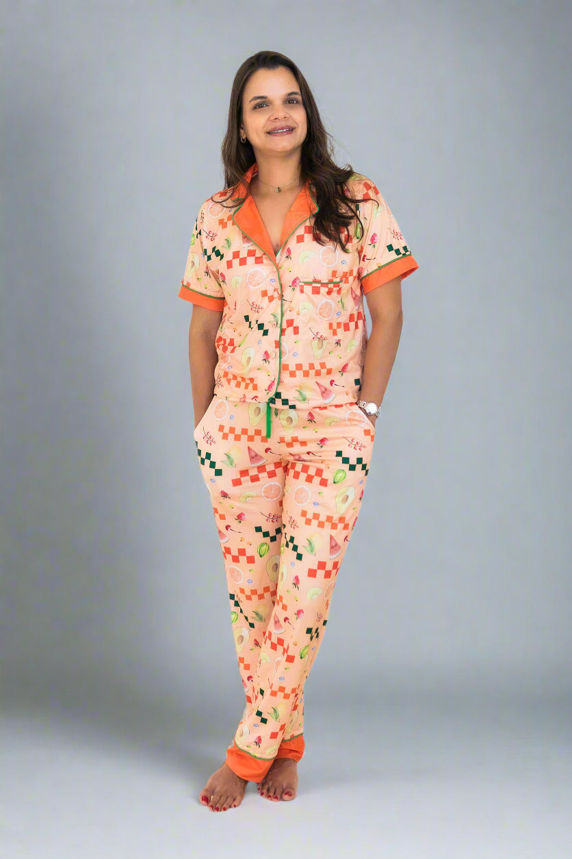 This set from our Citrus Breeze collection features juicy fruit motifs and playful color blocks, perfect for brightening up your downtime. Made with ultra-soft Peach Skin fabric, it pairs a short-sleeve button-down top with full-length pants for the ultimate cozy-chic look.