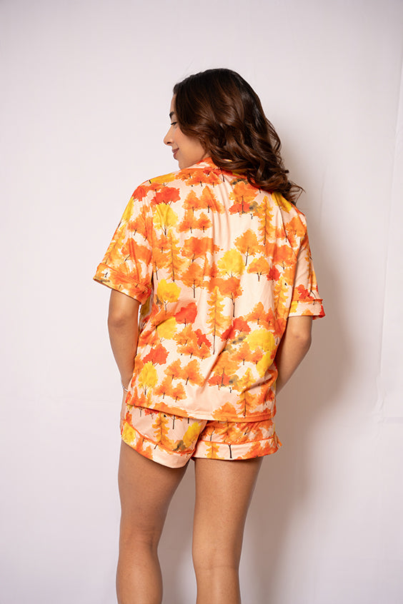 Light up your evenings with our Aurora pajama set, decorated with a vibrant orange and yellow leaf pattern. Available in styles from long pants to shorts with matching tops, ensuring comfort in every cut. The Peach Skin fabric provides a soft and gentle touch, ideal for peaceful nights or relaxed days. A great choice for stylish, comfy sleepwear