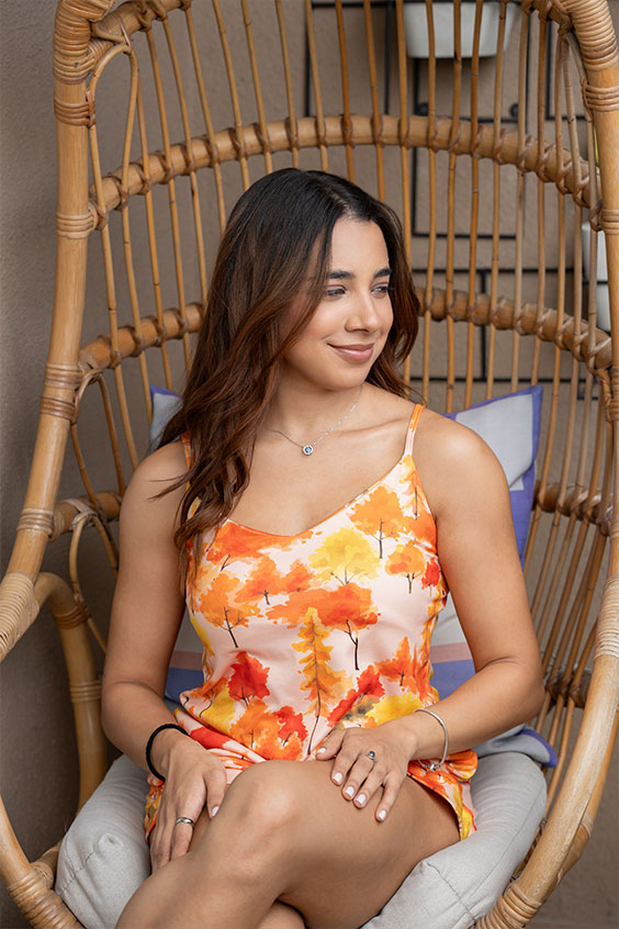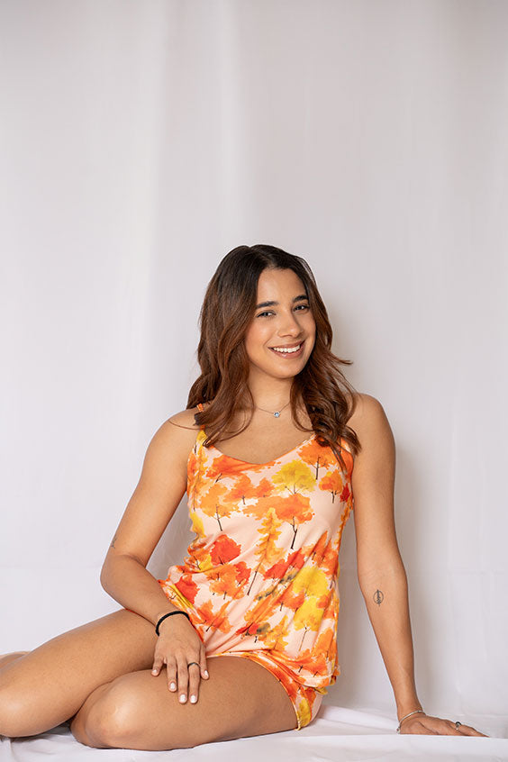 Brighten your nights with our Canela pajama set, designed with an eye-catching orange and yellow leaf print. Whether you prefer long pants or shorts, each set comes with a cozy top to match. Crafted from our ultra-soft Peach Skin fabric, these pajamas offer both comfort and style for your sleep or lounging needs. They're perfect for all ages.